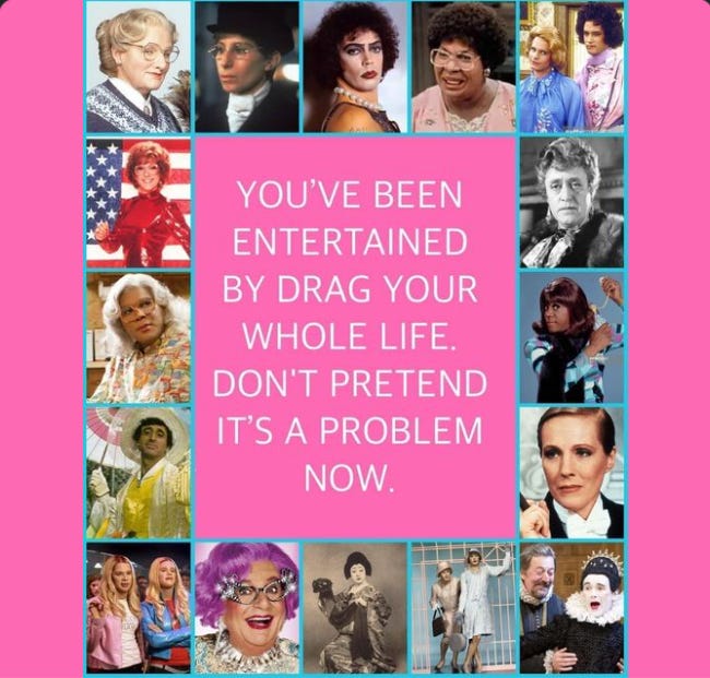 First, Drag refers to a very specific form of adult entertainment with sexual overtones and none of these are Drag. The closest might be Dr. Frank 'N' Furter from Rocky Horror and second, none of that was specifically targeted at children and even the ones kids might have been reasonably expected to see had a comedy-based reason, that was totally non-sexual, for being dressed as a woman. This is not at all the same as Drag shows for kids or Drag queen story hours (here and here) that are clearly grooming events.